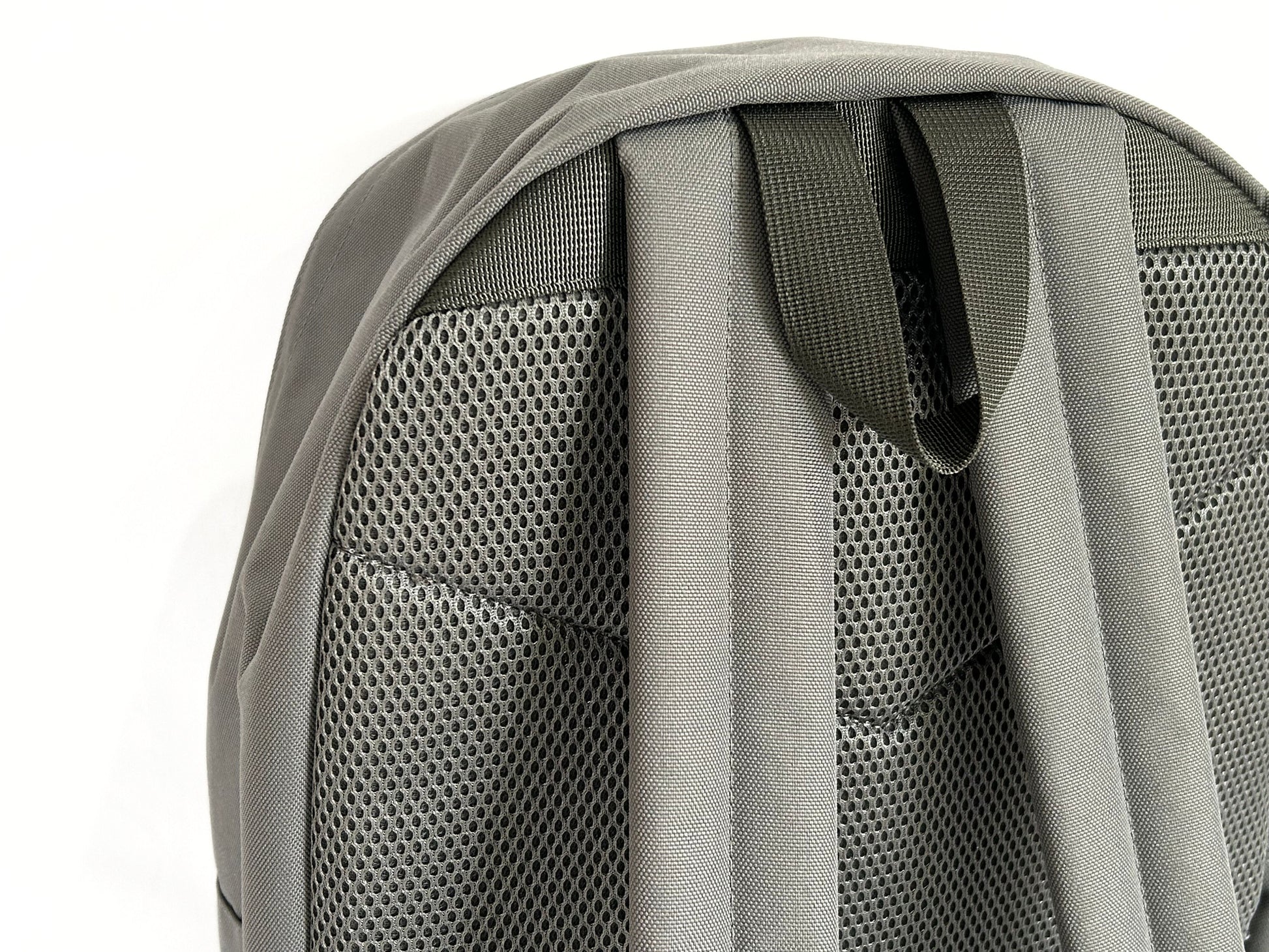 背面には通気性が良いラッセルメッシュを採用し、ニットなどの上から背負っても毛玉になりにくい仕様。